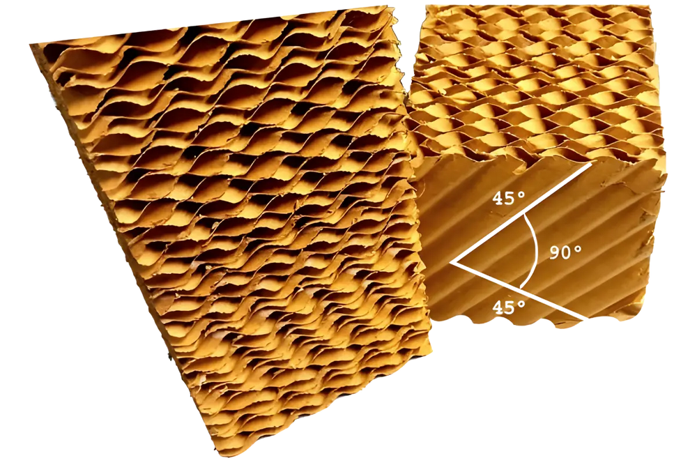 Alta velocidad: La estructura de ángulos del panel permite manejar altas velocidades de aire sin arrastre de gotas. El Panel de Enfriamiento Evaporativo está hecho de Celulosa.