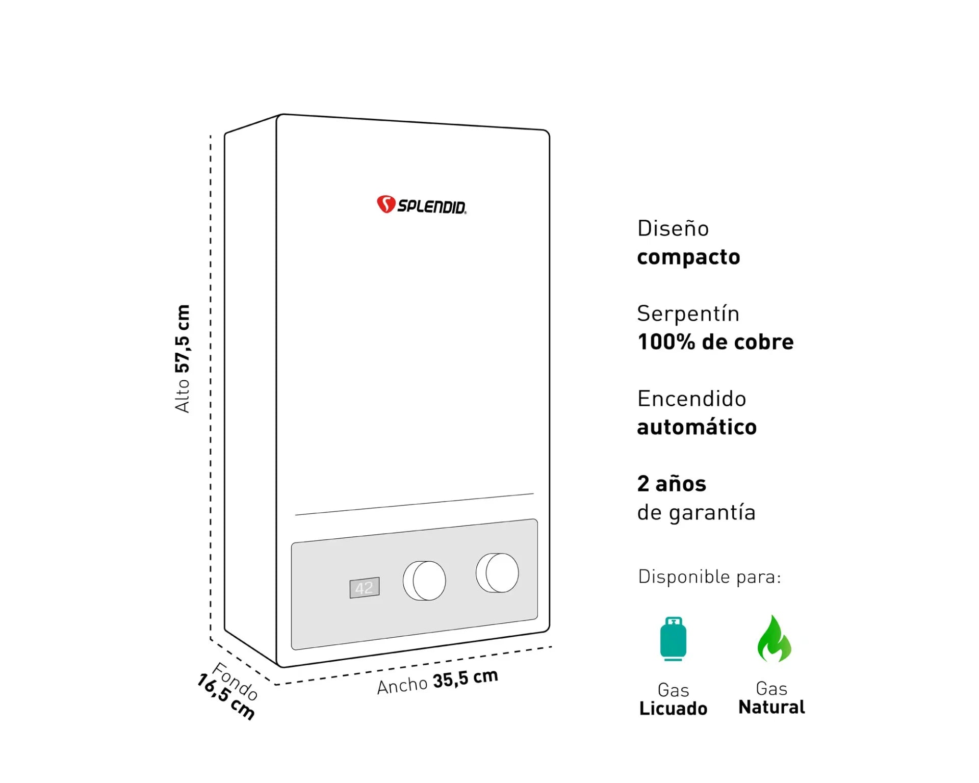 Obtén agua caliente confiable y eficiente con el calefont tiro forzado Splendid Master de 13 litros a gas natural. Este equipo de cámara abierta no utiliza llama piloto ni válvula de agua, lo que reduce el costo de mantenimiento y garantiza un encendido rápido apenas abres la llave.- Capacidad de 13 litros por minuto y eficiencia energética A para suministrar agua caliente a múltiples puntos de tu hogar.