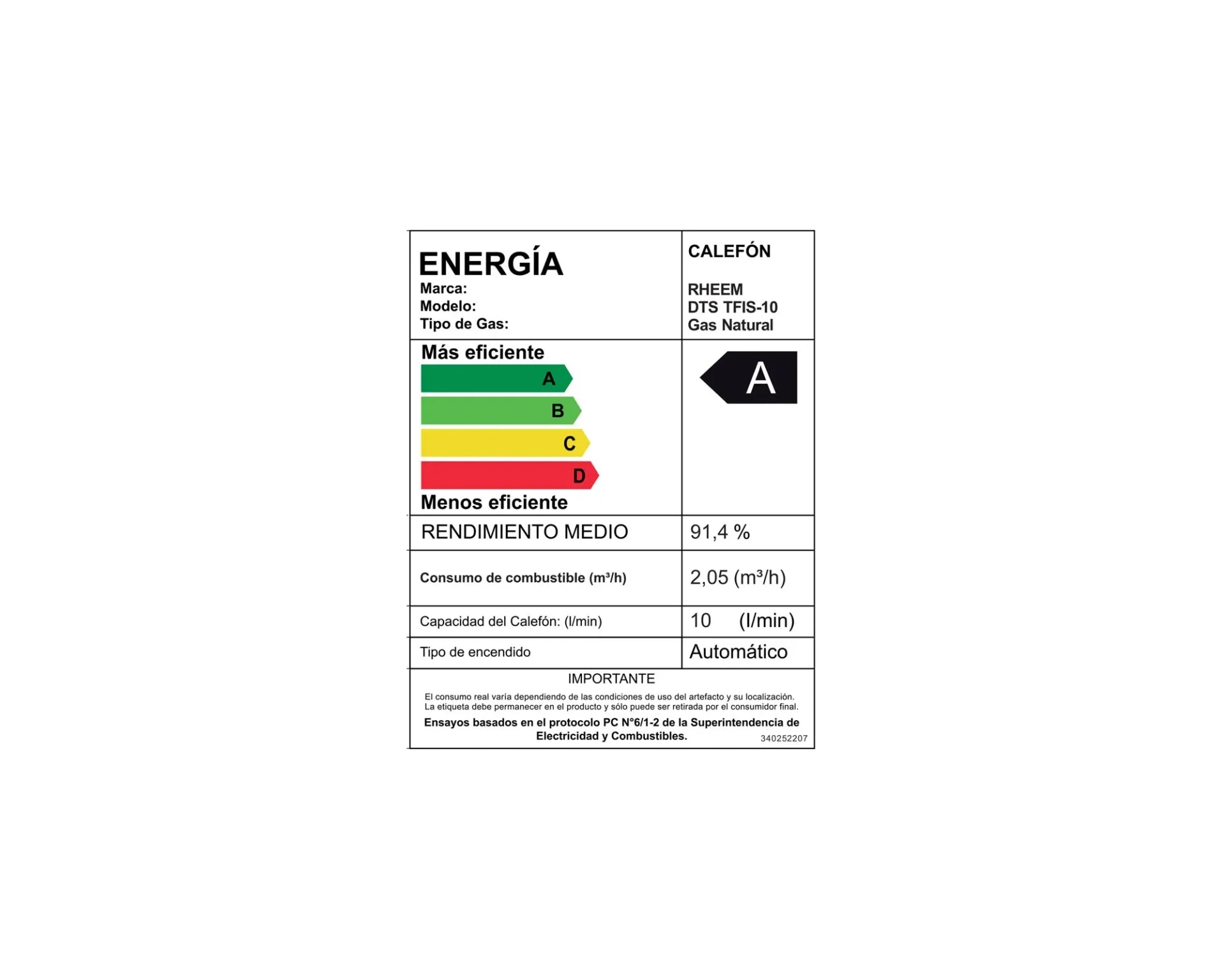 La seguridad en la instalación interior es una prioridad, y se logra mediante el sistema de Tiro Forzado, que garantiza la expulsión controlada y completa de los gases de combustión al exterior. El calefont está clasificado con la máxima Eficiencia Energética Clase A, lo que se traduce en un ahorro inteligente de gas.